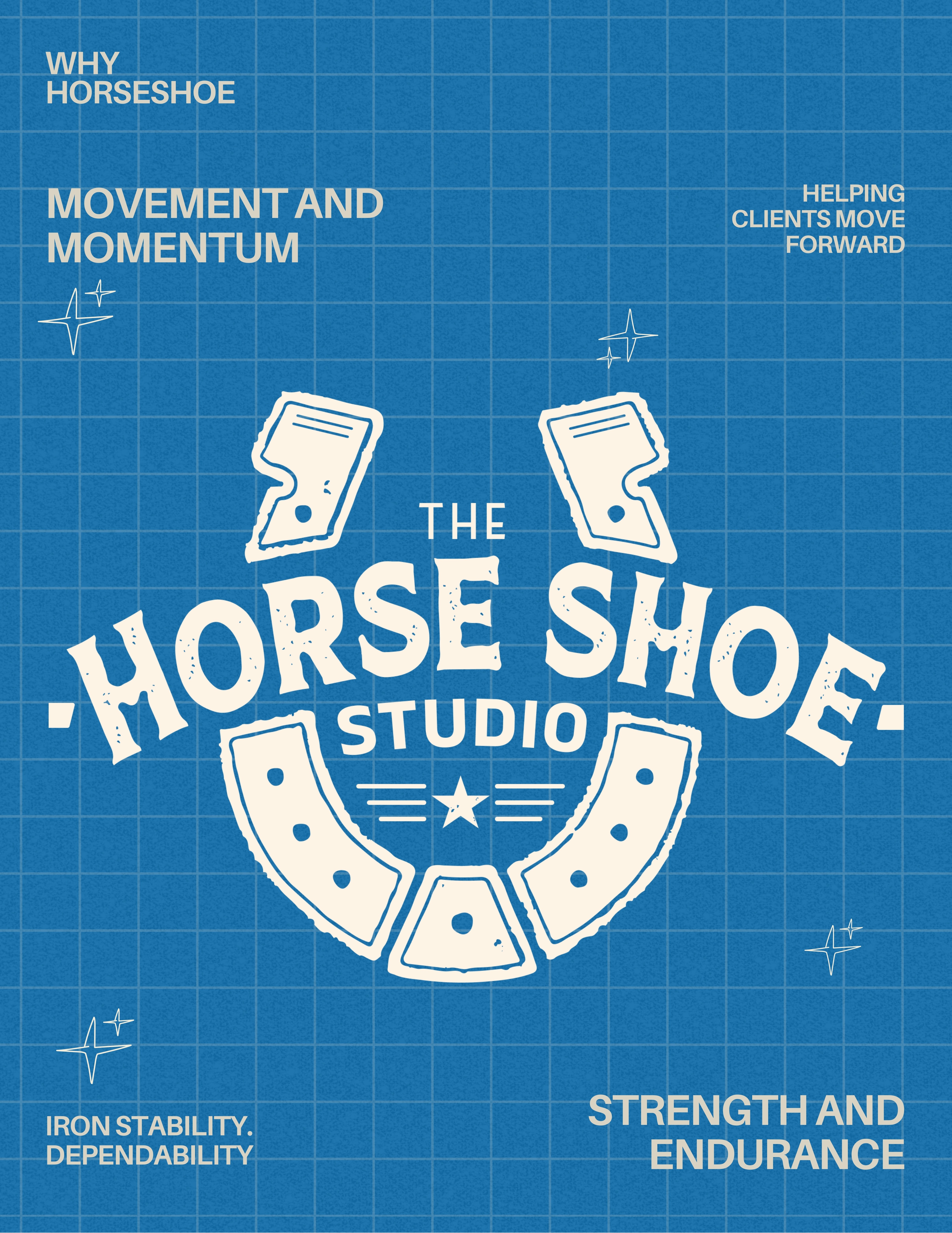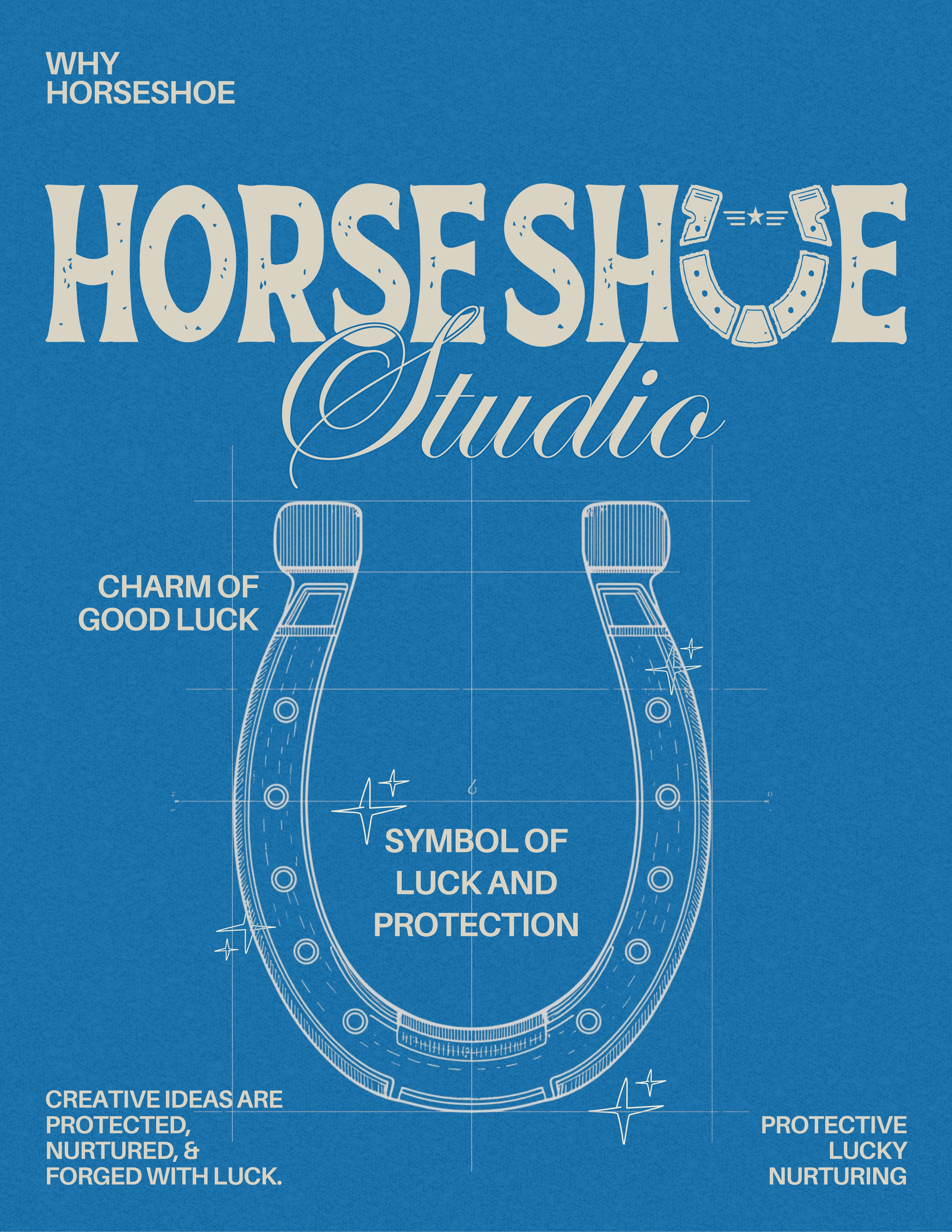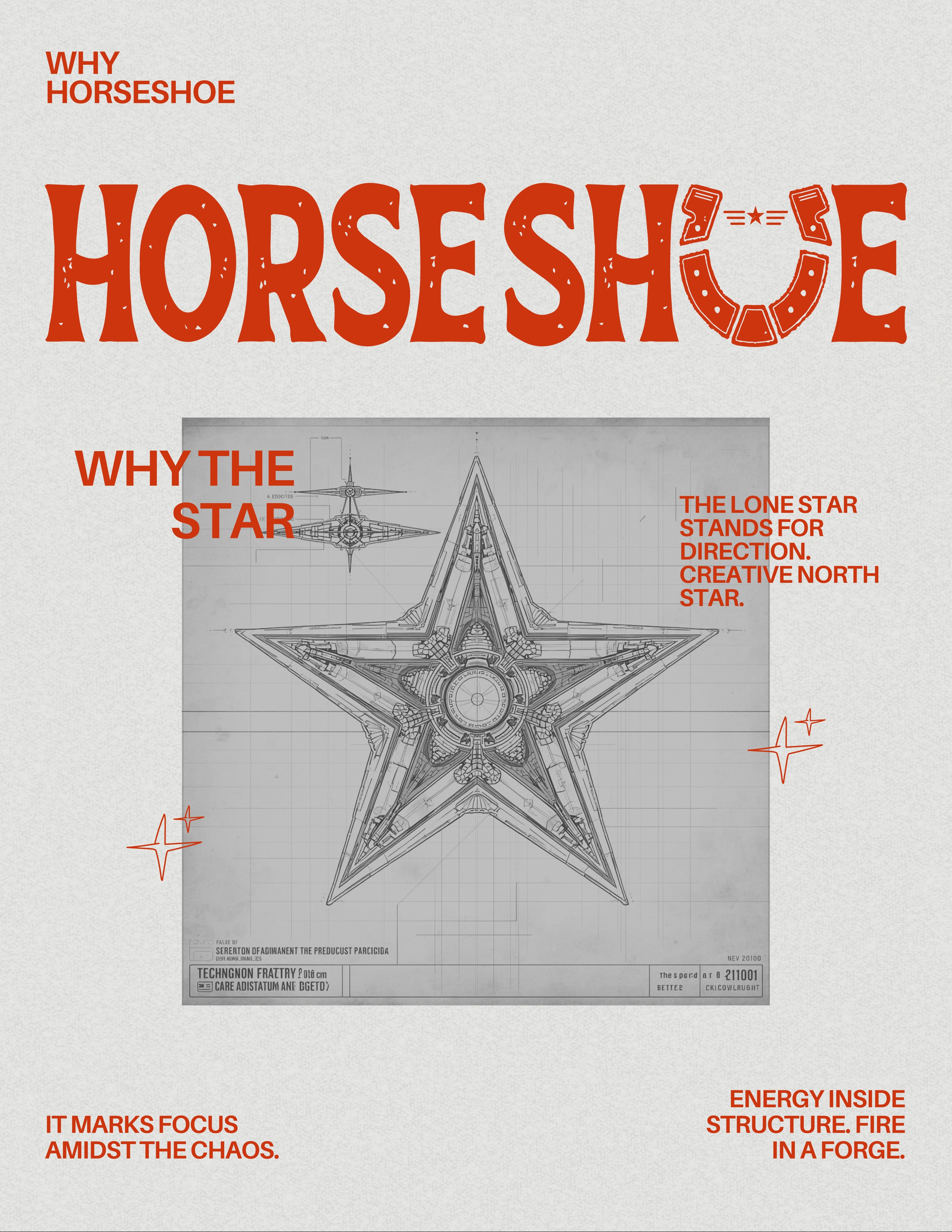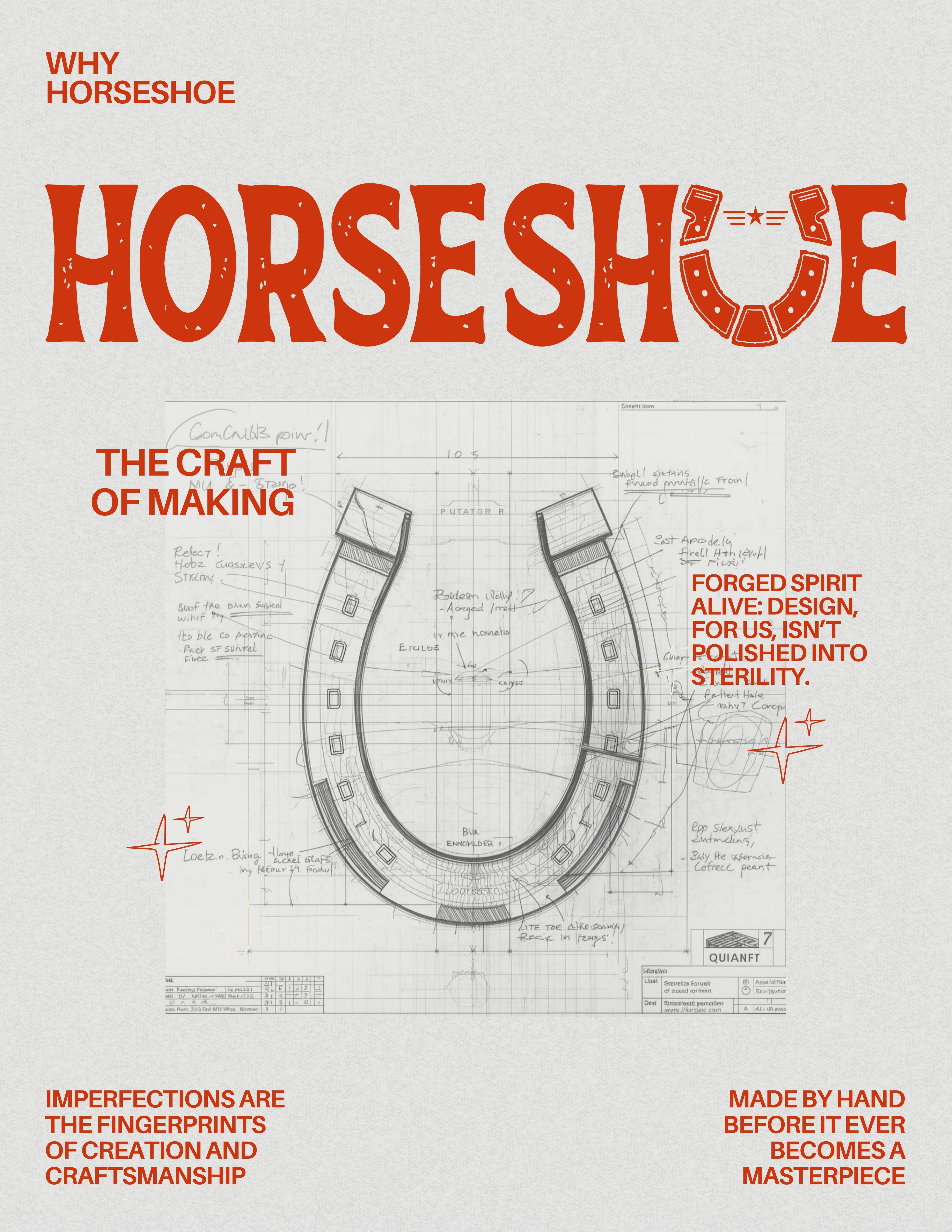 The texture, the rough edges, the illustrated rivets—they echo the hammer-and-anvil origins of a real horseshoe. It hints at the studio’s hands-on attitude: design shouldn’t look lab-sterile; it should feel alive. Imperfections add personality. They prove the maker exists.