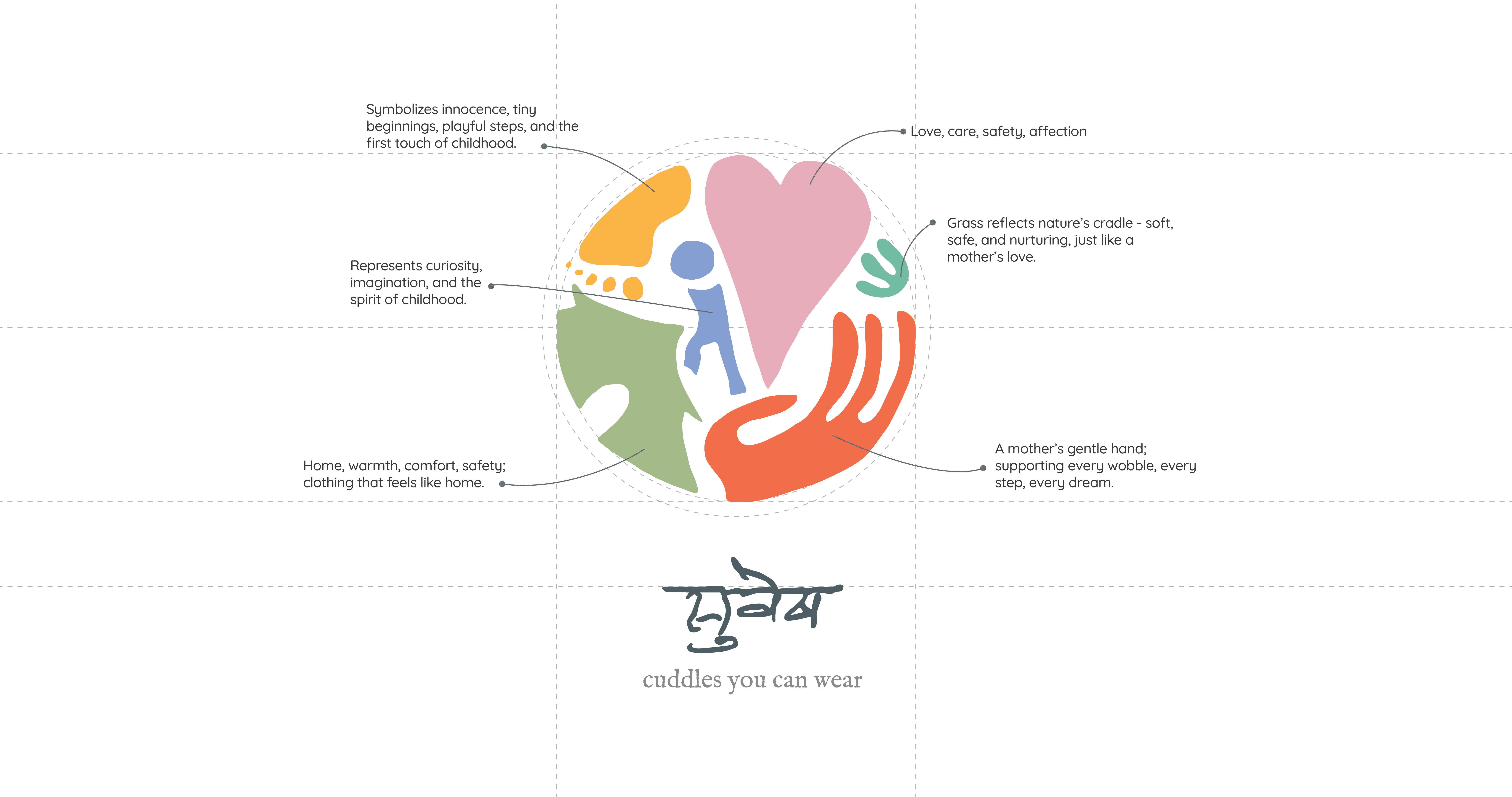 Children move through the world with curiosity and wonder. We wanted the brand to embody that same sense of unfiltered joy. At the centre sits the essence of childhood: tiny steps, soft shapes, gentle lines, and warm, familiar colours. Every piece of the symbol carries meaning.
